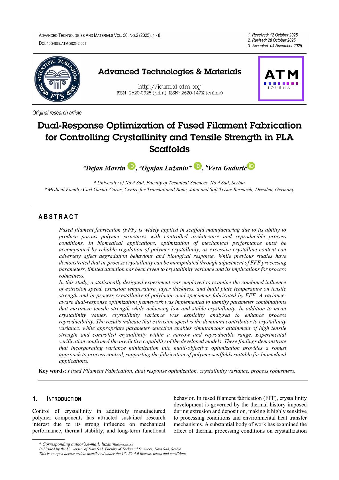 Movrin, D., Lužanin, O., & Gudurić, V. (2025). Dual-Response Optimization of Fused Filament Fabrication for Controlling Crystallinity and Tensile Strength in PLA Scaffolds. Advanced Technologies and Materials, 50(2), 1–8. https://doi.org/10.24867/ATM-2025-2-001